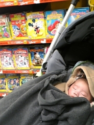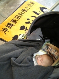初めてのヨドバシカメラ。 うるさい音に負けずよく寝る。 |