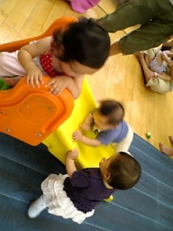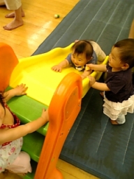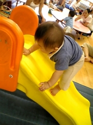 | 渋谷にある東京都児童館にて。 滑り台を逆から上るのにはまってました。 コタ、滑り台の楽しさを知しりました♪ |