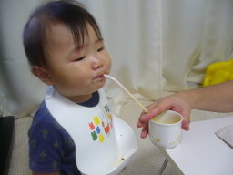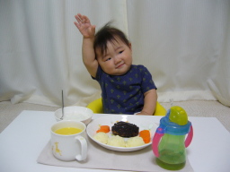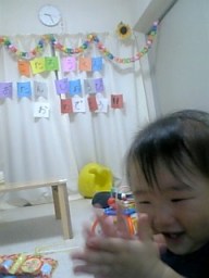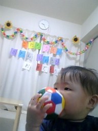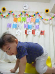 11ヶ月目(7/21-8/21) ■手をどこにもつかずに立つ、一人立ちが上手になった。 つかまって立って手を離したり、座った状態から手をつかずに立ち上がったりが 上手にスムーズにできるようになった。 立ってパチパチと拍手して自画自賛している。 ■手をつないでのあんよが少ししっかりしてきた。 まだ一人では歩けないものの、手つなぎあんよが以前はグニャグニャだったけど少し力づよくなってきた。 ■ものを入れたり捨てるのが大好き 毎日宝探しごっこ。 いろんなものをいろんなところに入れるから大変! 好きなとこ―冷凍庫、冷蔵庫の野菜室、炊飯器、空きペットボトル入れ、ベランダ、玄関、風呂がま、寝室の箱、 テレビのラック、ドライヤー入れ、空調機の後ろ、など ・パパの携帯が冷凍庫でキンキンに冷やされてたり、 ・ものを炊飯器に入れられて気付かず一緒に焚いてしまった ・ボールを2つも窓から下に放り捨てた。 ・シングルCDはめちゃくちゃ ・オーディオのボリュームの丸いつまみを外す ■手づかみで食べる練習 ボーロやおせんべえを手で食べるので、パンをちぎったのや小さいサンドイッチにして 前におき自分で食べさせる。 バナナを一本のそのまま口に入れてみたらモグモグ食いついてなかなか離れない!かわいい。 ■コップで飲む練習 なぜかコップでミルクは飲むのは嫌いで飲まない。 ジュースだと上手に飲める。 ジュースはたまにしかあげていない。 ストローの水筒の麦茶は飲むと必ず後ろに捨てる。マラソンの給水所か! ■スプーンを手ににぎったまま離さない 食べる時だけでなく、ずーとスプーンを握っている。離そうとすると怒るので持たせてしまった。 ハイハイの時も絶対離さない。時には両手の時も・・ ■言葉は最近進捗なし。 ママママもパパパパもあまり言わなくなってしまった。 「うぉい!」みたいな声で呼ぶようになった。亭主関白風?? 声の物まねもまだしない。 ■上の前歯がようやく少しでてきた! 遅い・・ ■本に興味がでてきたみたい 絵本を一人でめくっている。めくるのが好き? ■ボールが大好き おもちゃの中でまだまだボール系が大好き。一番小さい玉が好きでカンカンならしたりどっかに入れたり。 大き目なボールは一人で投げたり。 ■パパにそっくり!ってしつこいくらい色んな人からよく言われる。 前からだけど、本当によく言われます。そんなにそっくりなのかな?? ママに似てるね、とはほとんど言ってくれません・・ 細くてやわらかい髪とか薄い唇とかママなんだけどね。 |