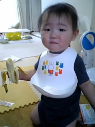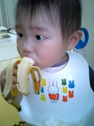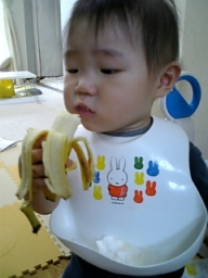 バナナを初めて一人で食べる。 うまい! 口を離さないし皮まで食べようとする、、 |